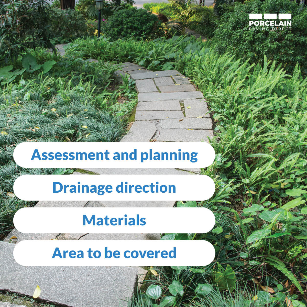 Drainage direction - Correct drainage is important, you don’t want water to be pooling next to your house or its foundations, but you also don’t want it to be directly draining onto another person’s property/a public area. Consider draining towards a lawn or planted area where water will naturally be absorbed into soil. If this isn’t possible, you’ll likely need to consider a ‘soakaway’, or a household storm drain if permitted.